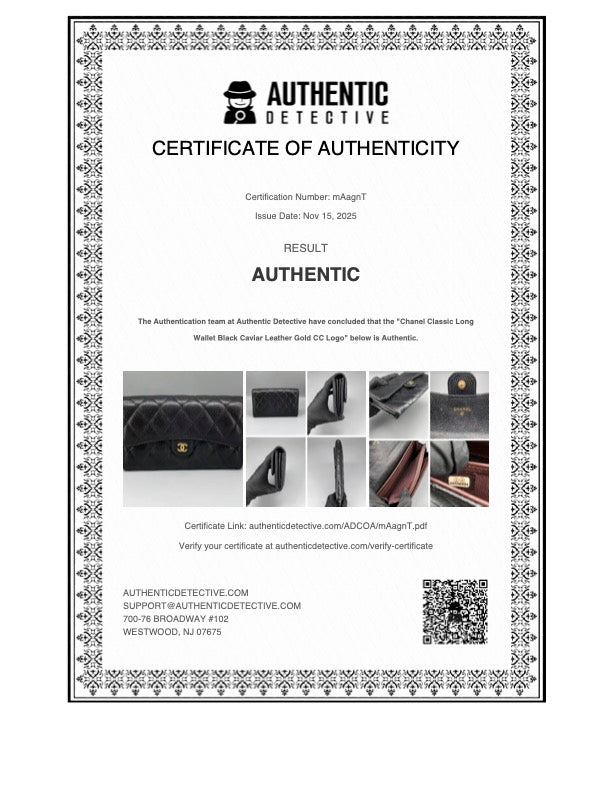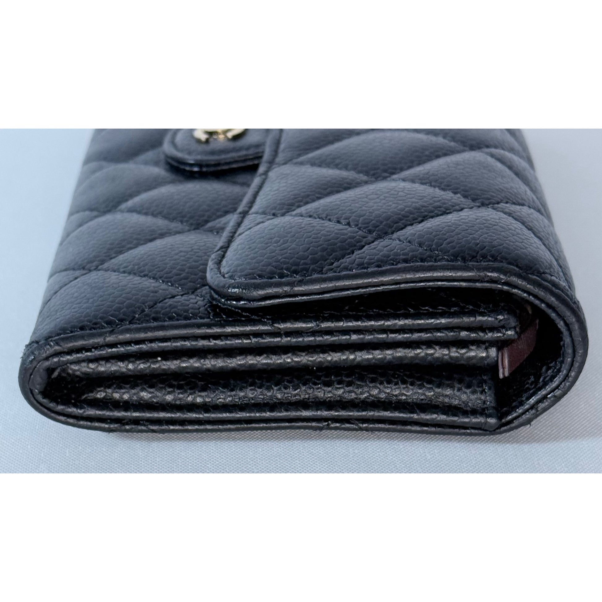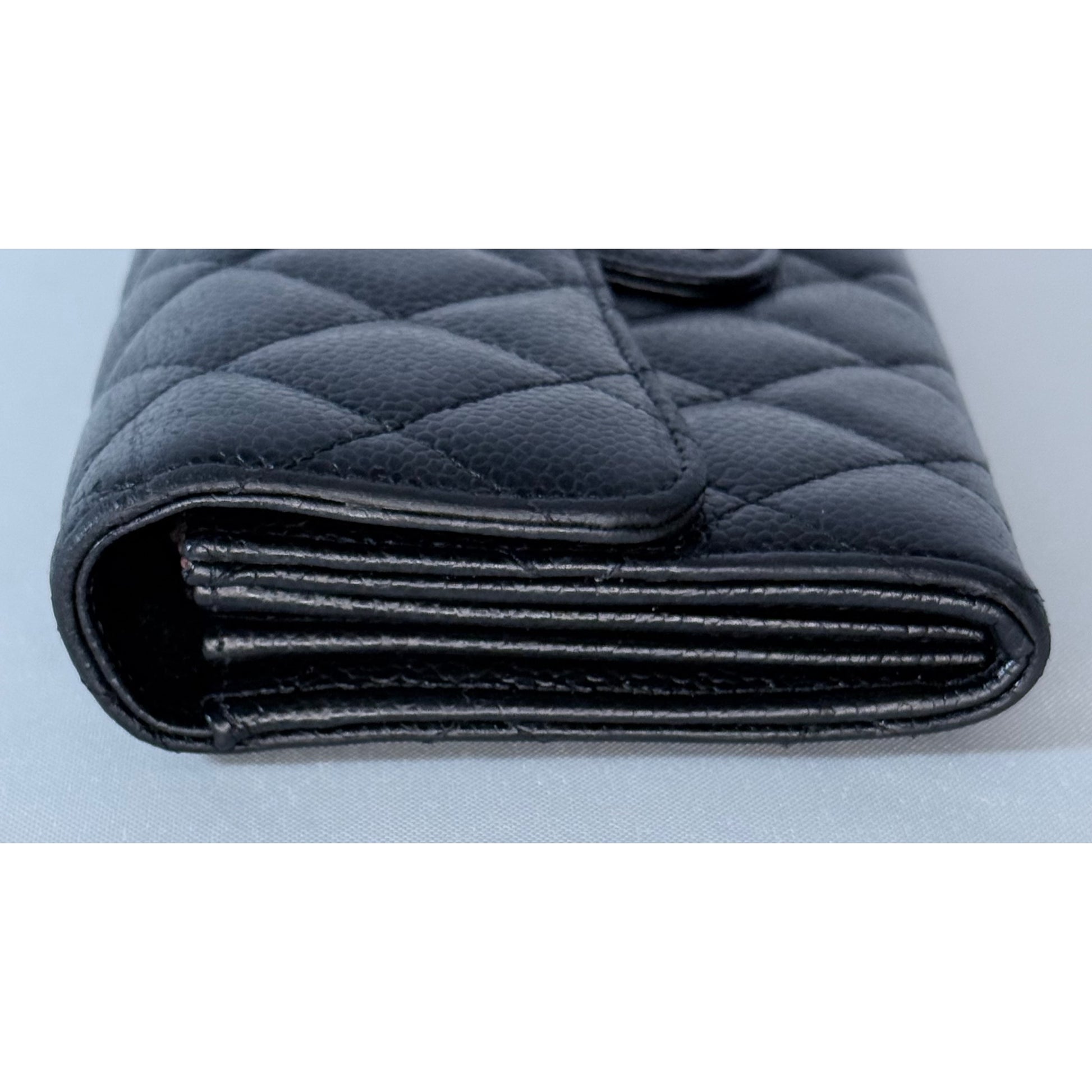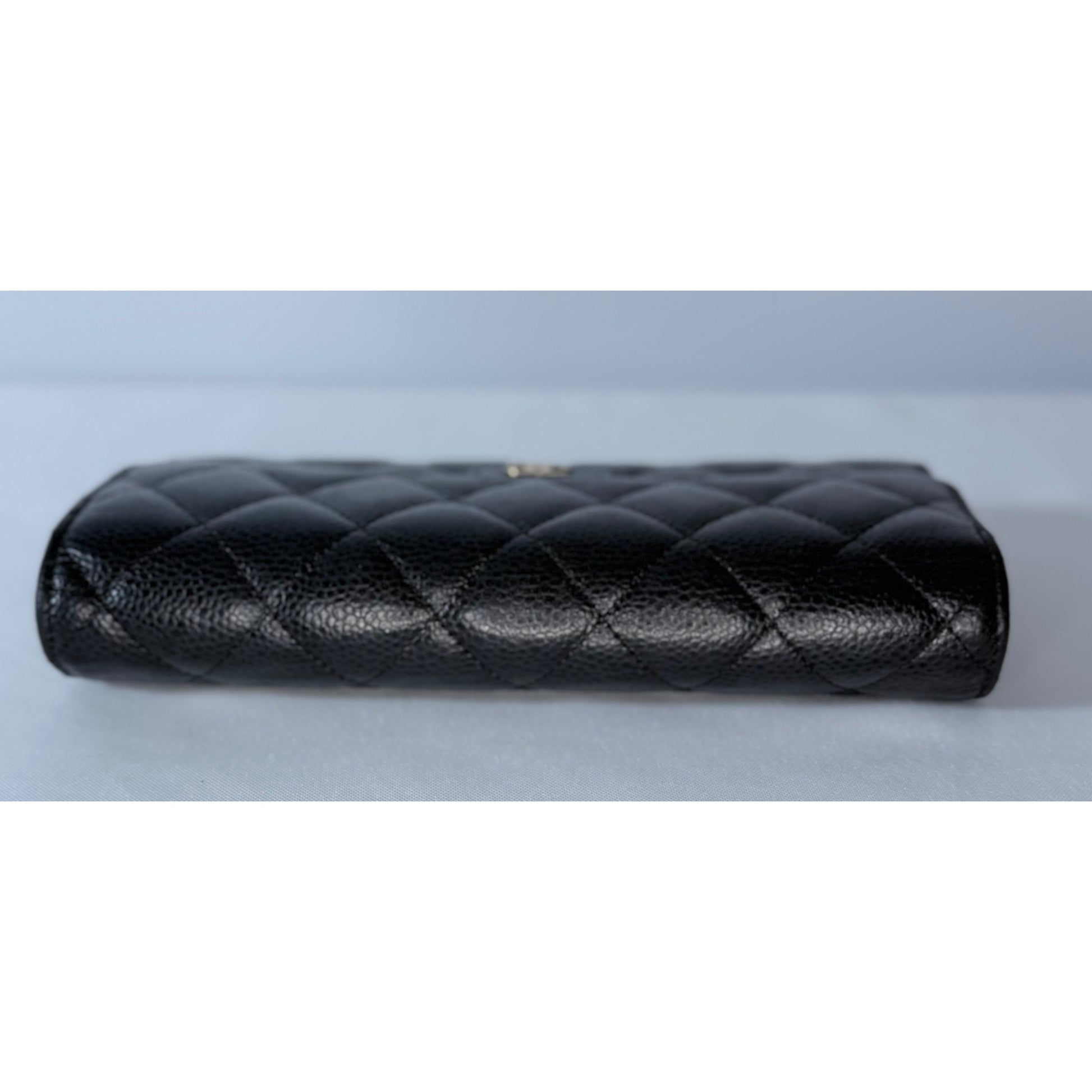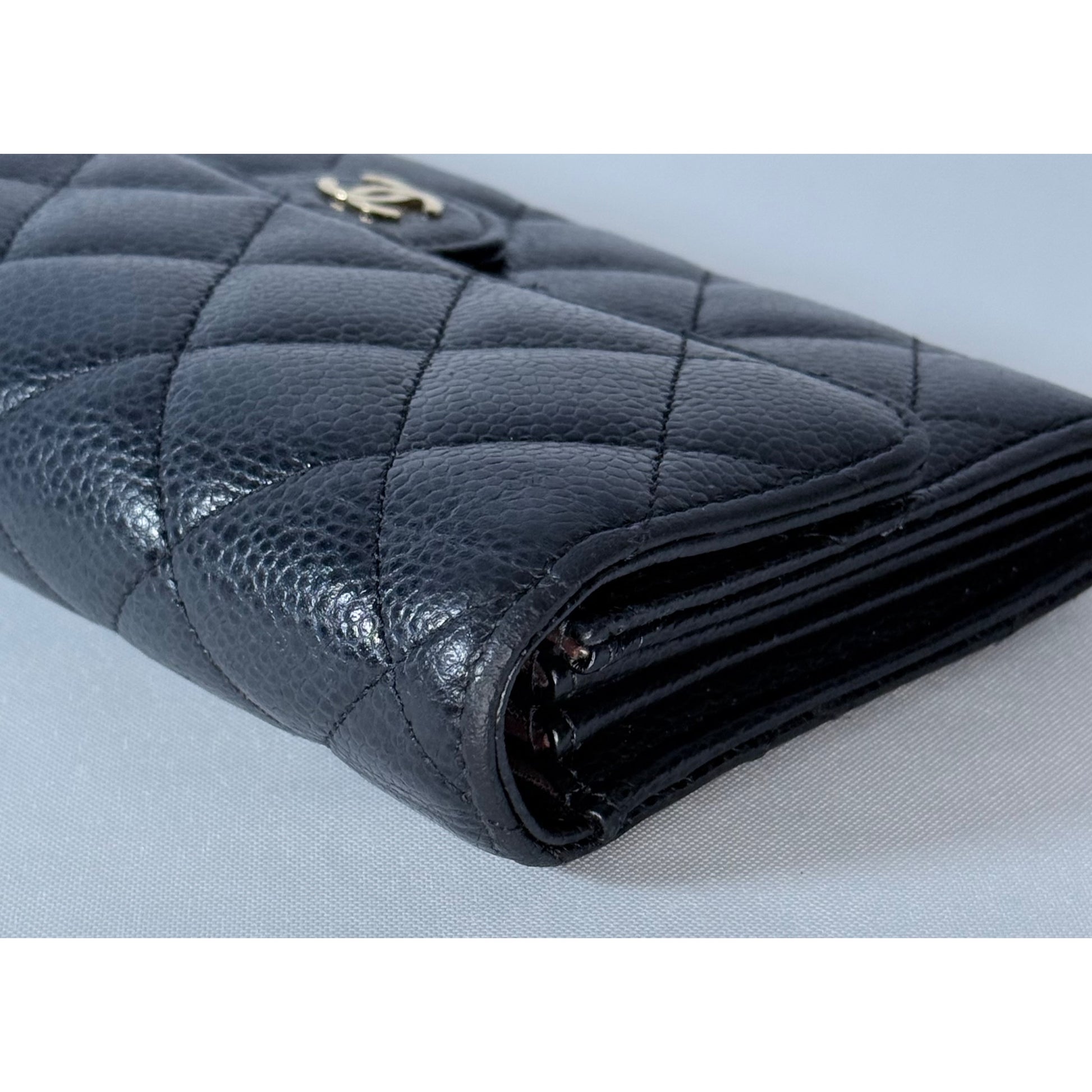 Quilted black caviar leather, gold-tone CC snap closure, multiple interior card slots and compartments, slim long-wallet silhouette.