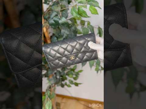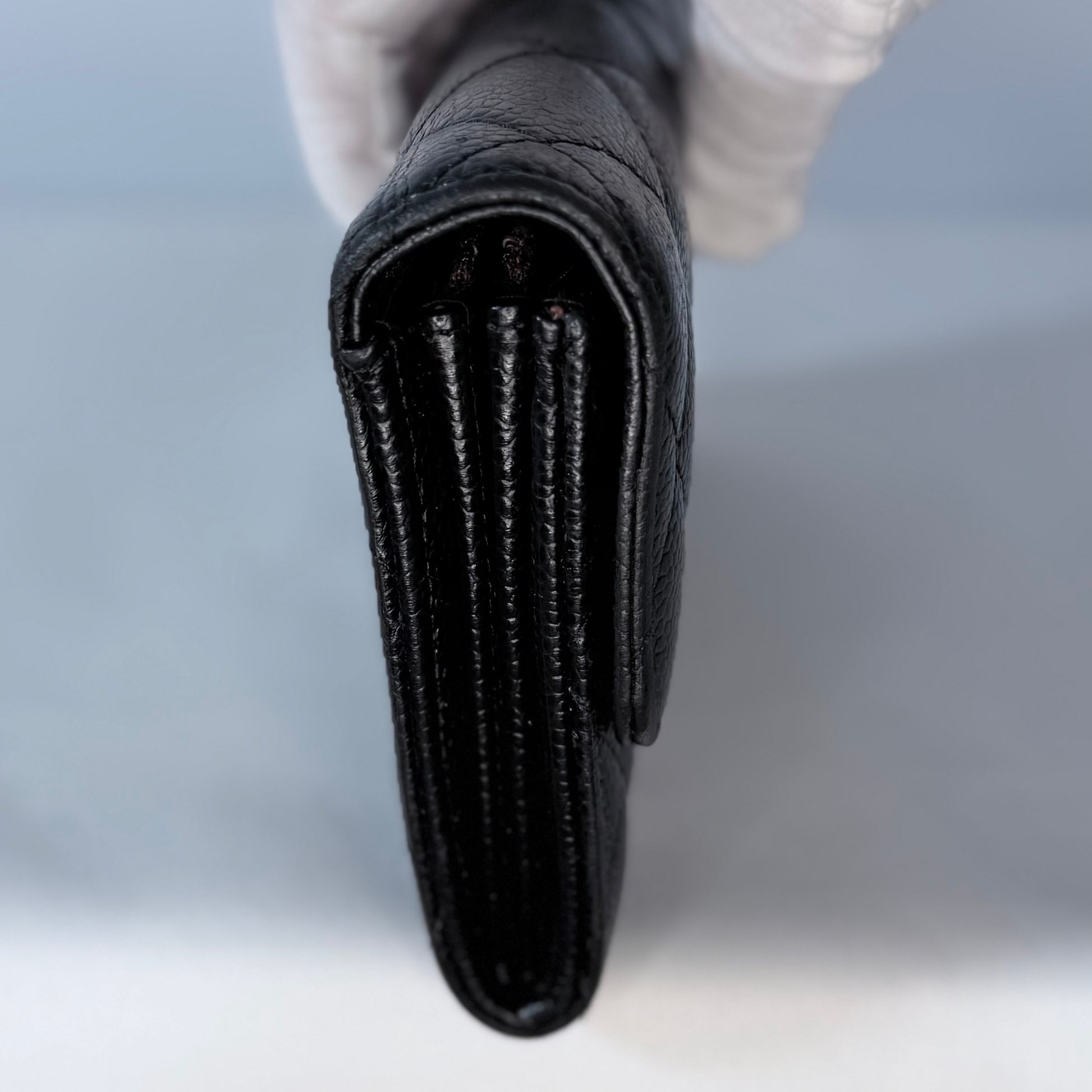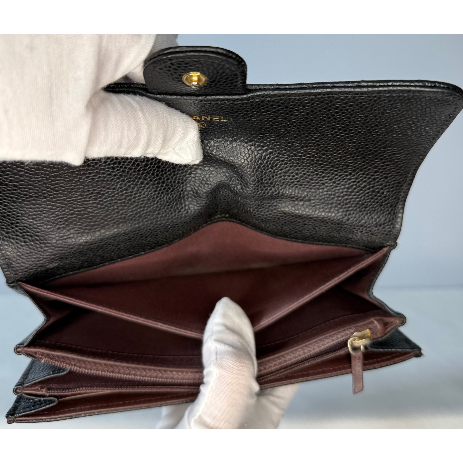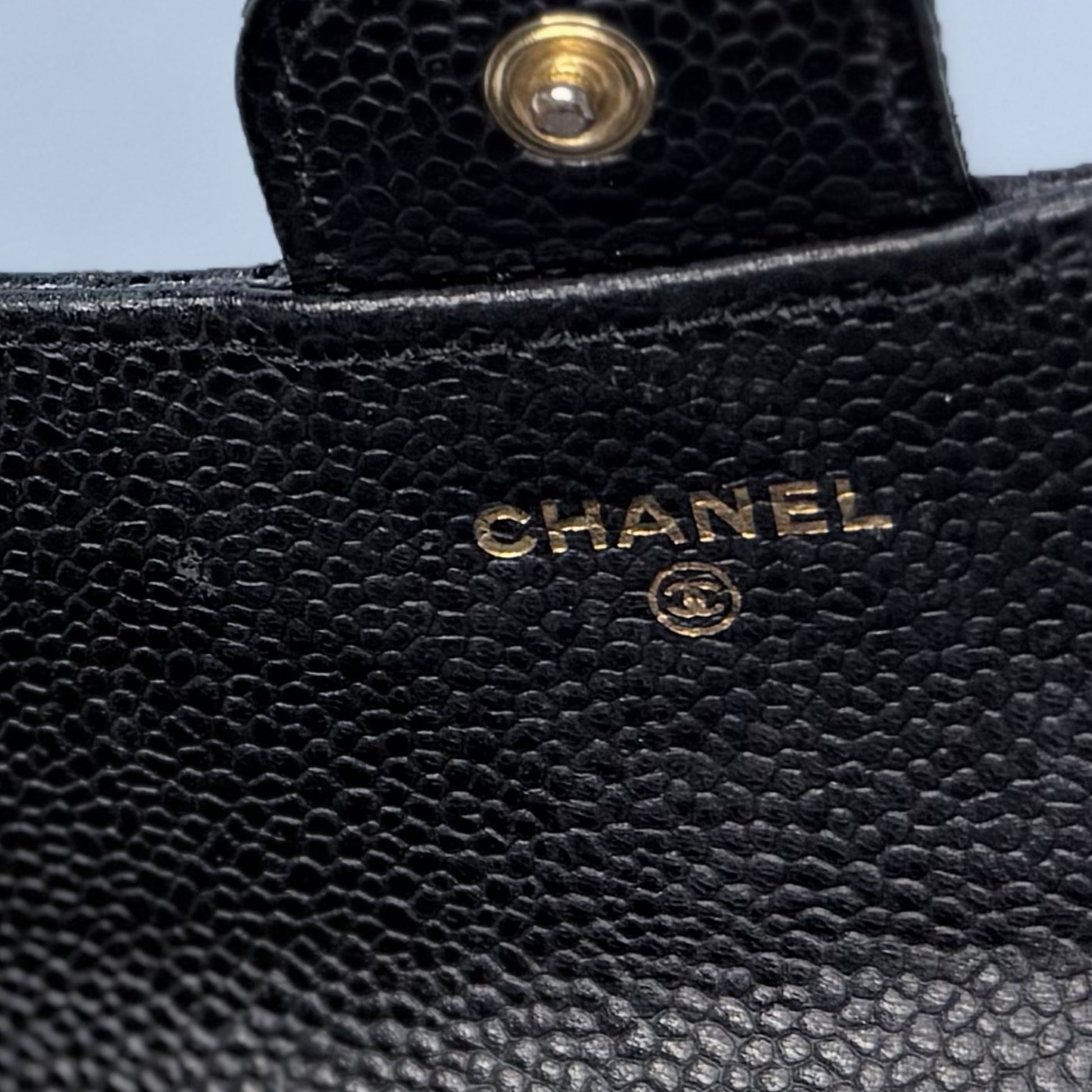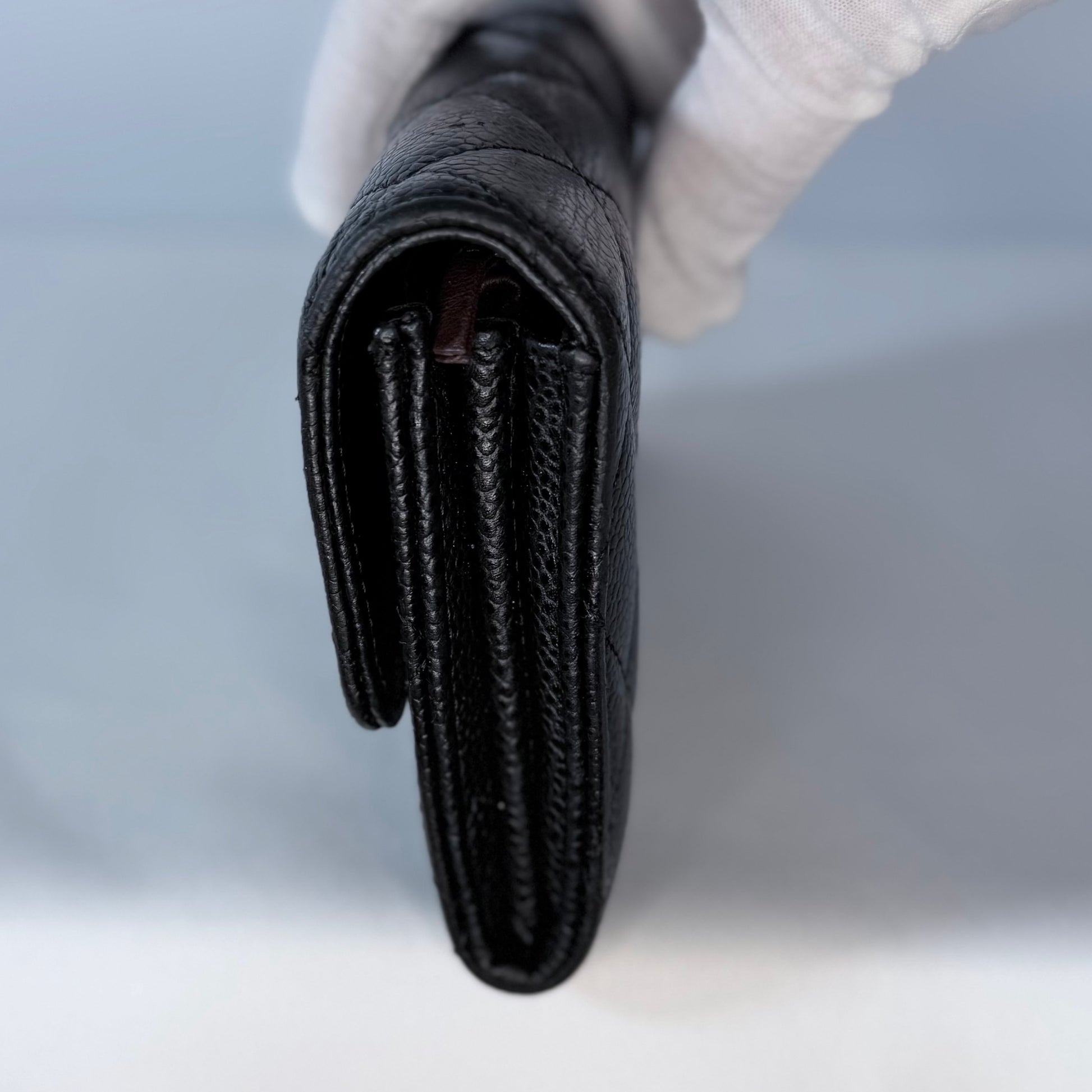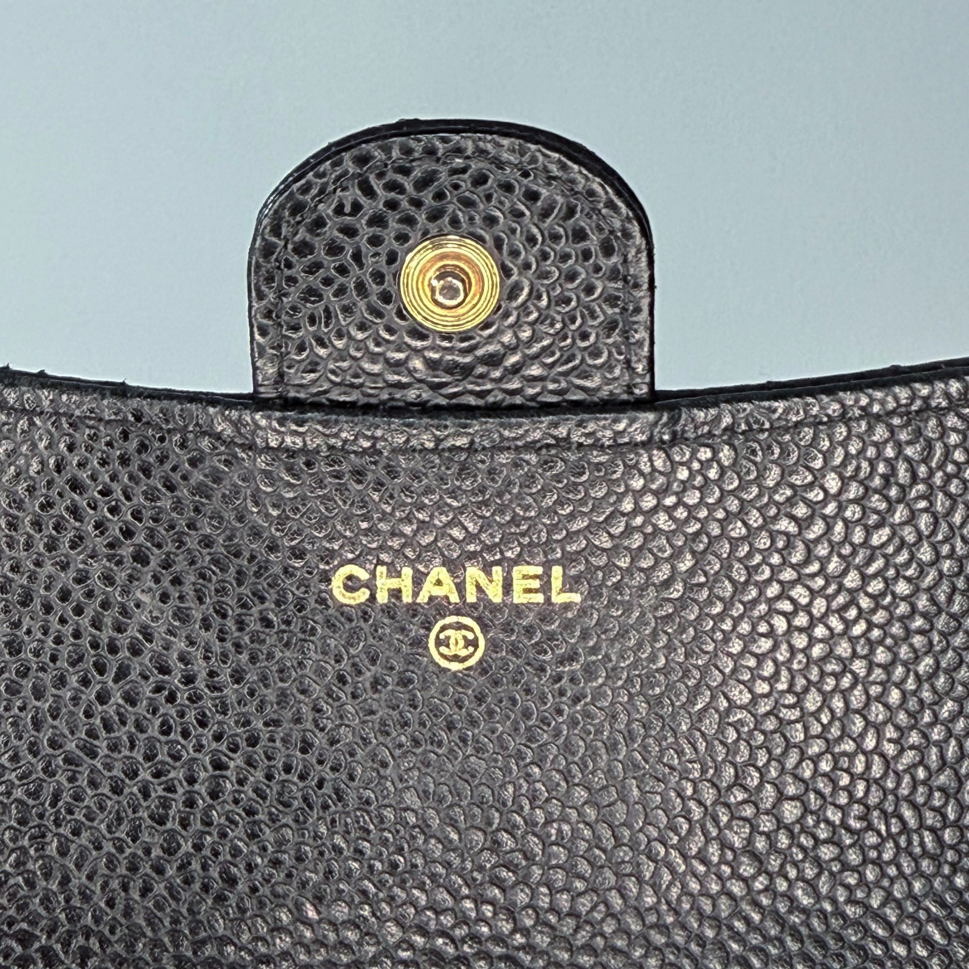 Quilted black caviar leather, gold-tone CC snap closure, multiple interior card slots and compartments, slim long-wallet silhouette.