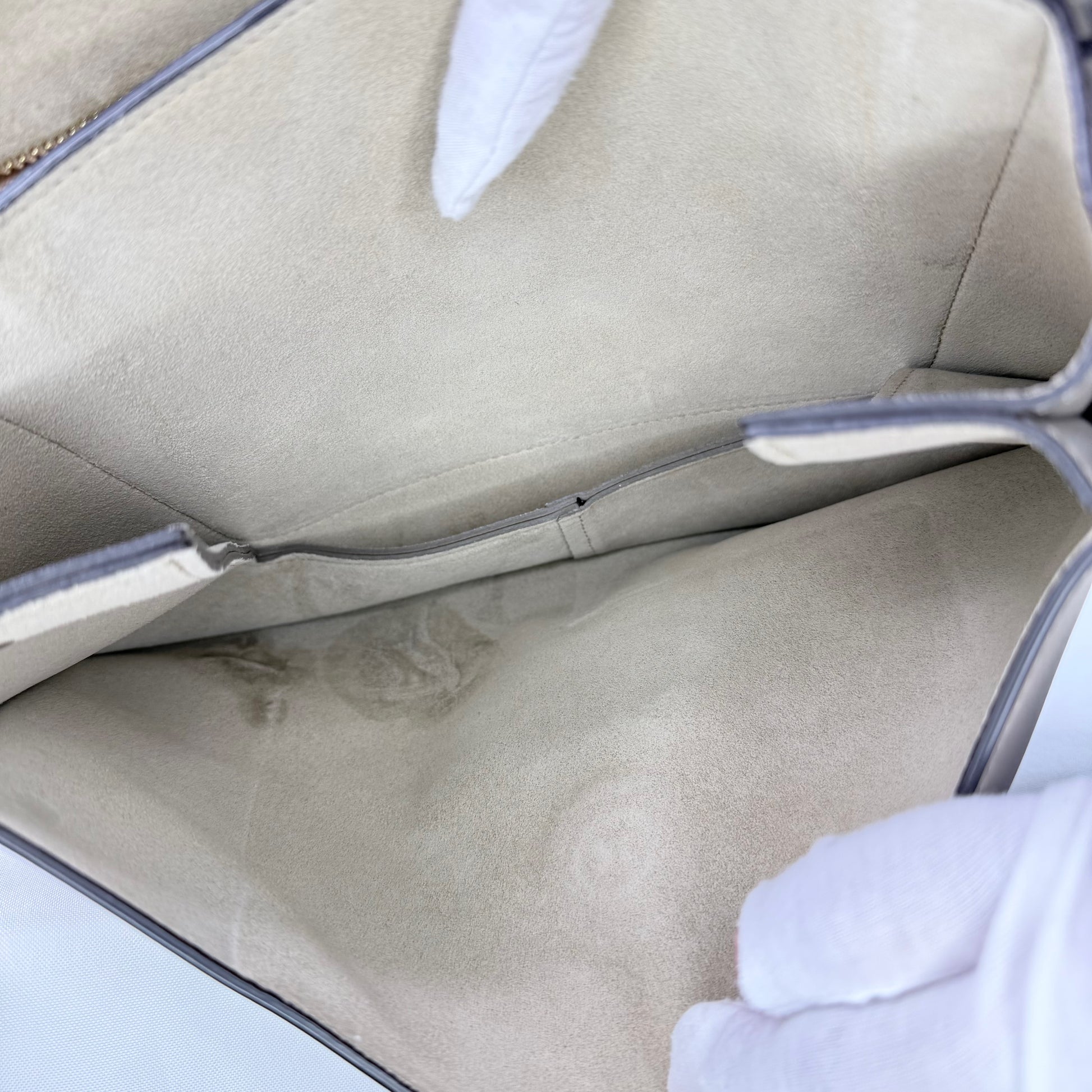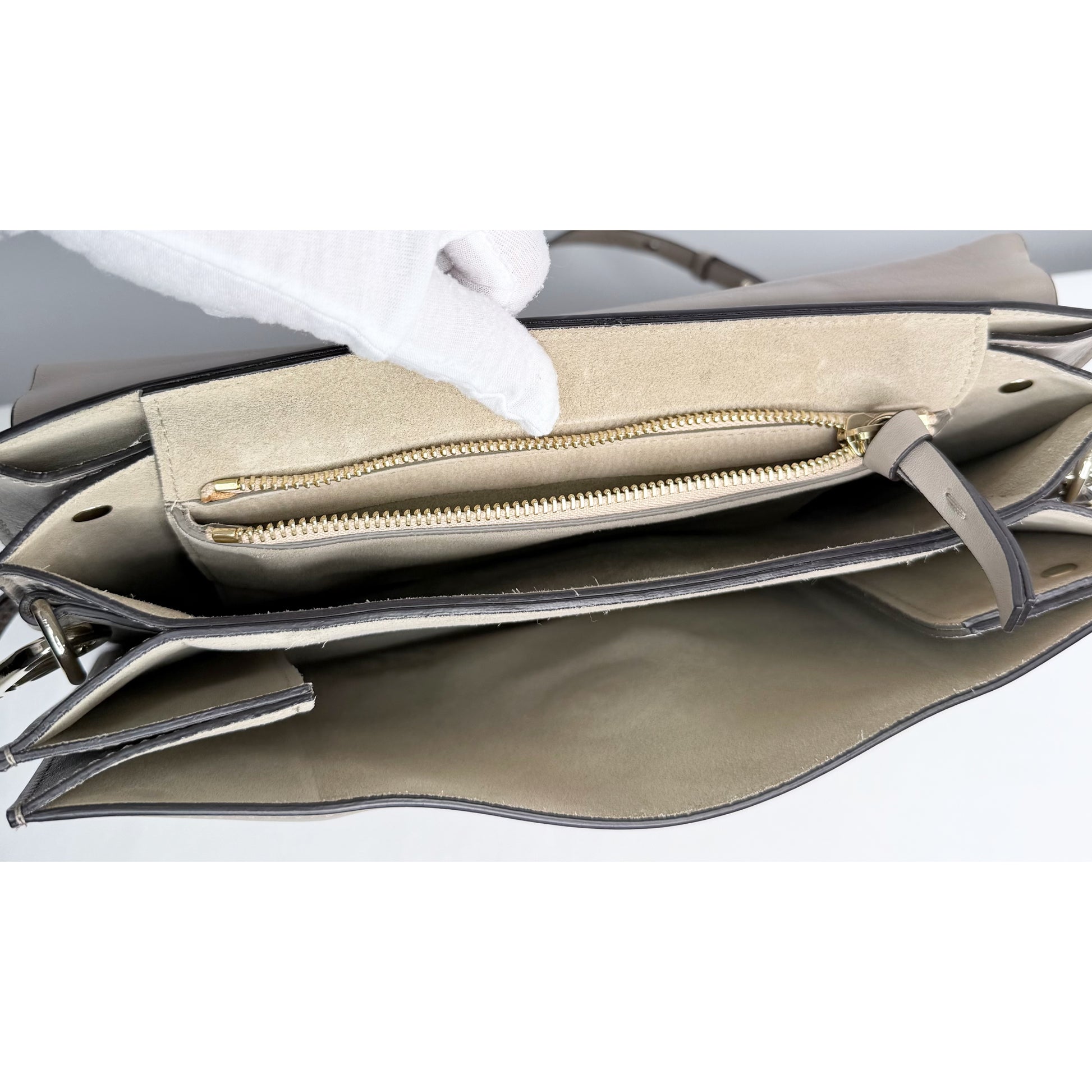 Interior: Tan suede lining with subtle signs of use visible within one interior pocket