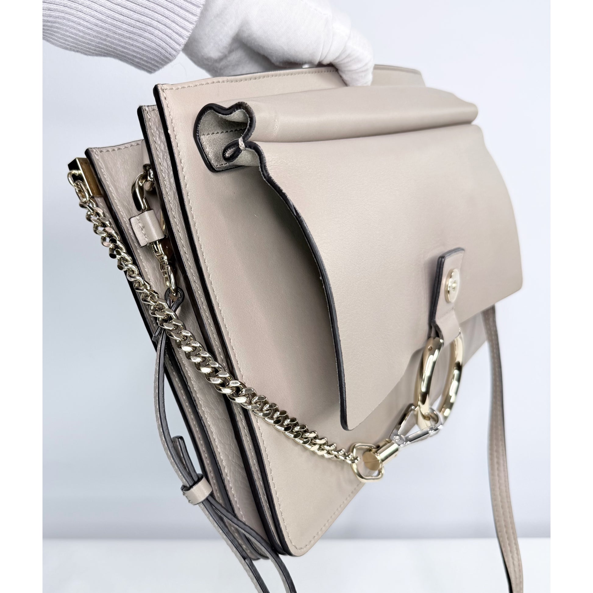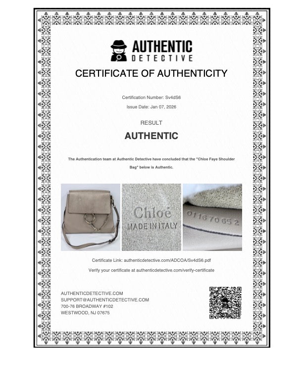 This Chloé Faye shoulder bag is crafted from taupe smooth leather with tonal suede trim and finished with the signature ring and chain-link hardware at the front. Produced in Italy circa 2016 during the Claire Waight Keller era, this design represents the original and most collectible version of the Faye. The structured silhouette, adjustable strap, and thoughtfully organized interior make it both practical and timeless, transitioning effortlessly from day to evening wear. Est. Retail CAD $3,500