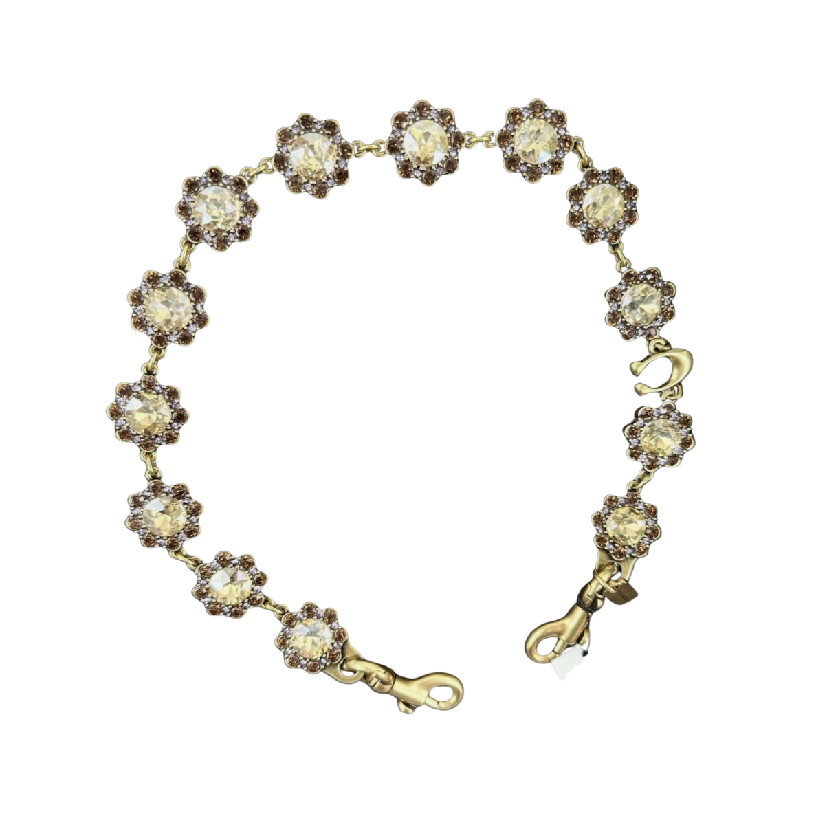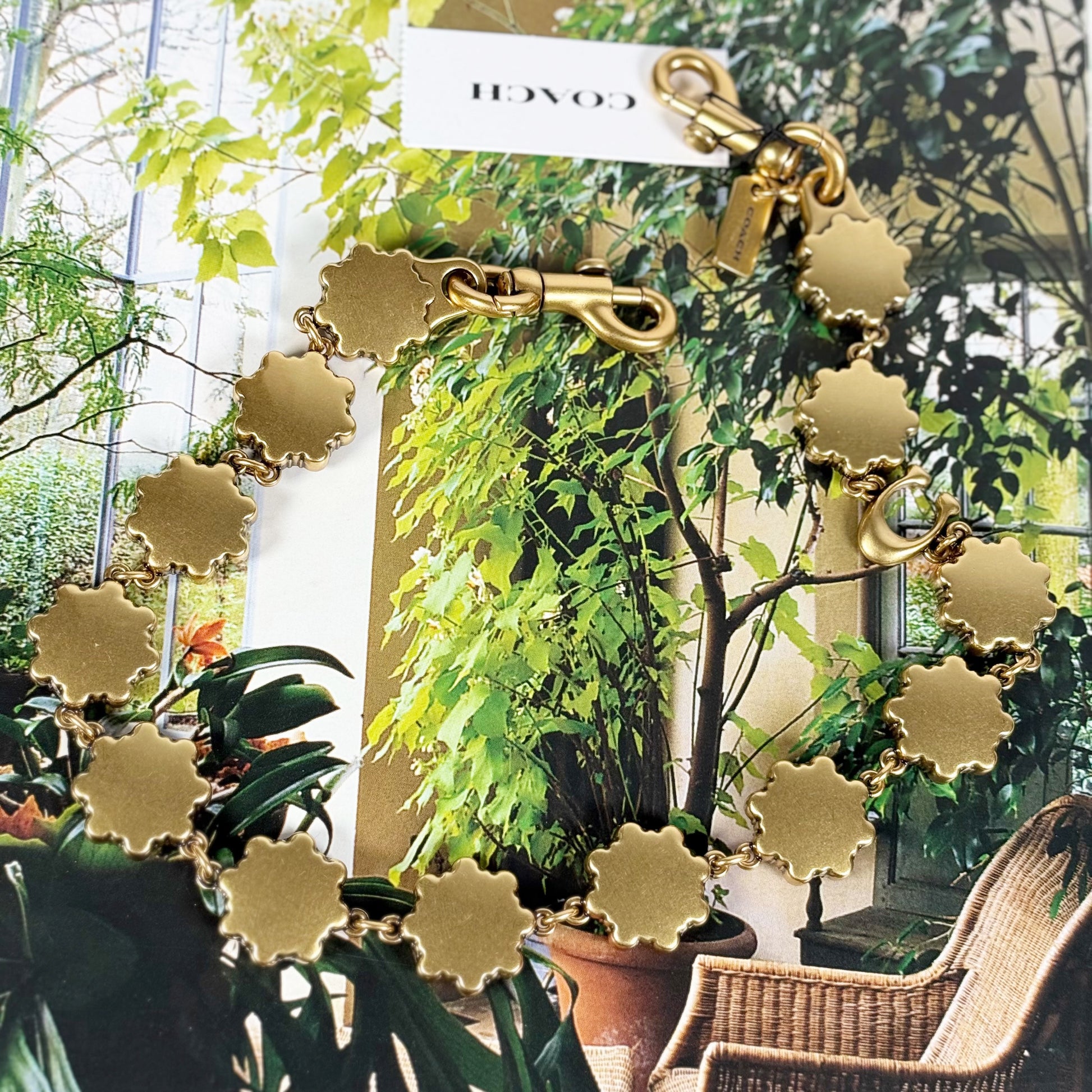 Authentic Coach Short Jewelry Chain Strap CAU47 in Brass/Yellow Multi with crystal floral clusters and Signature charm. Features dual dog leash clips for easy attachment.