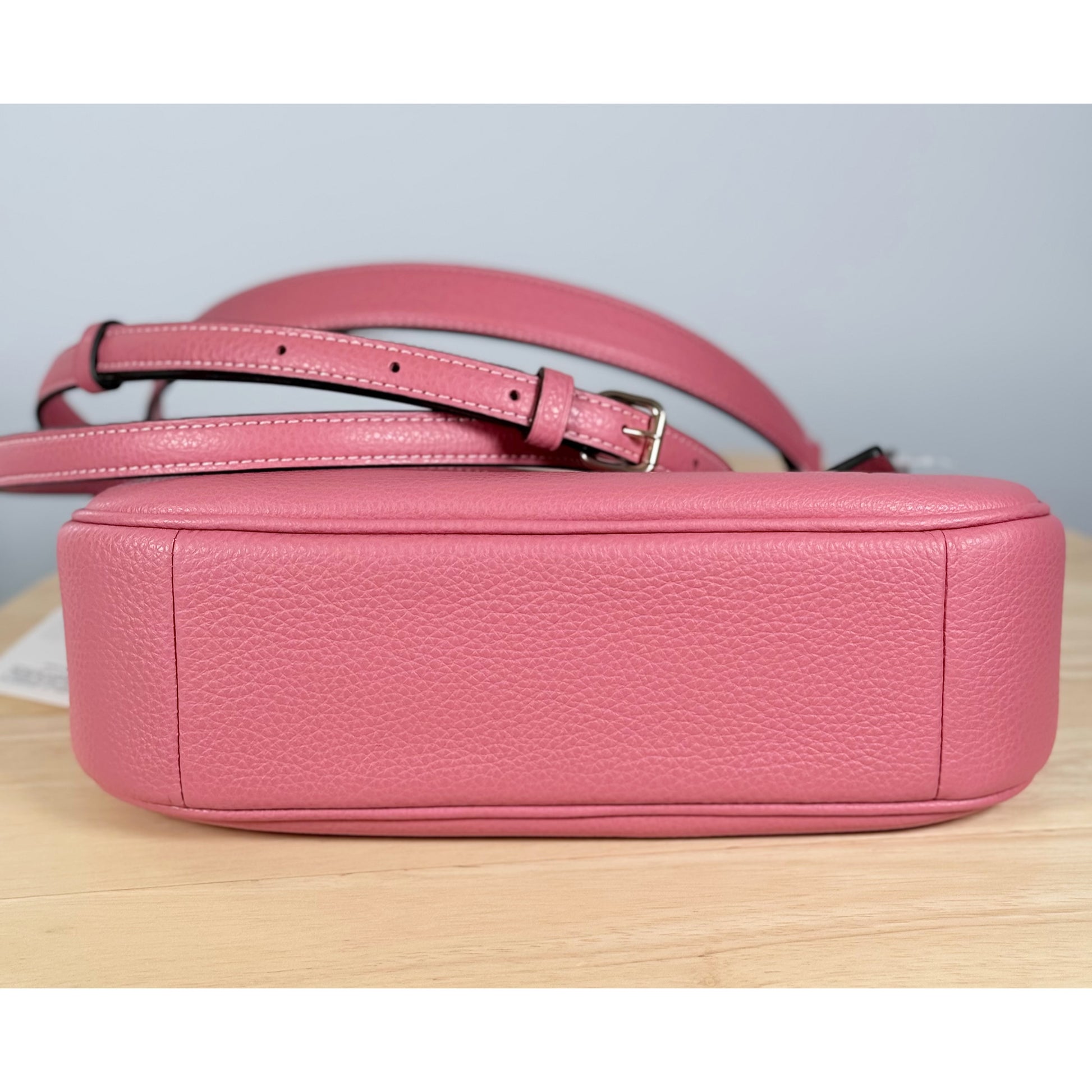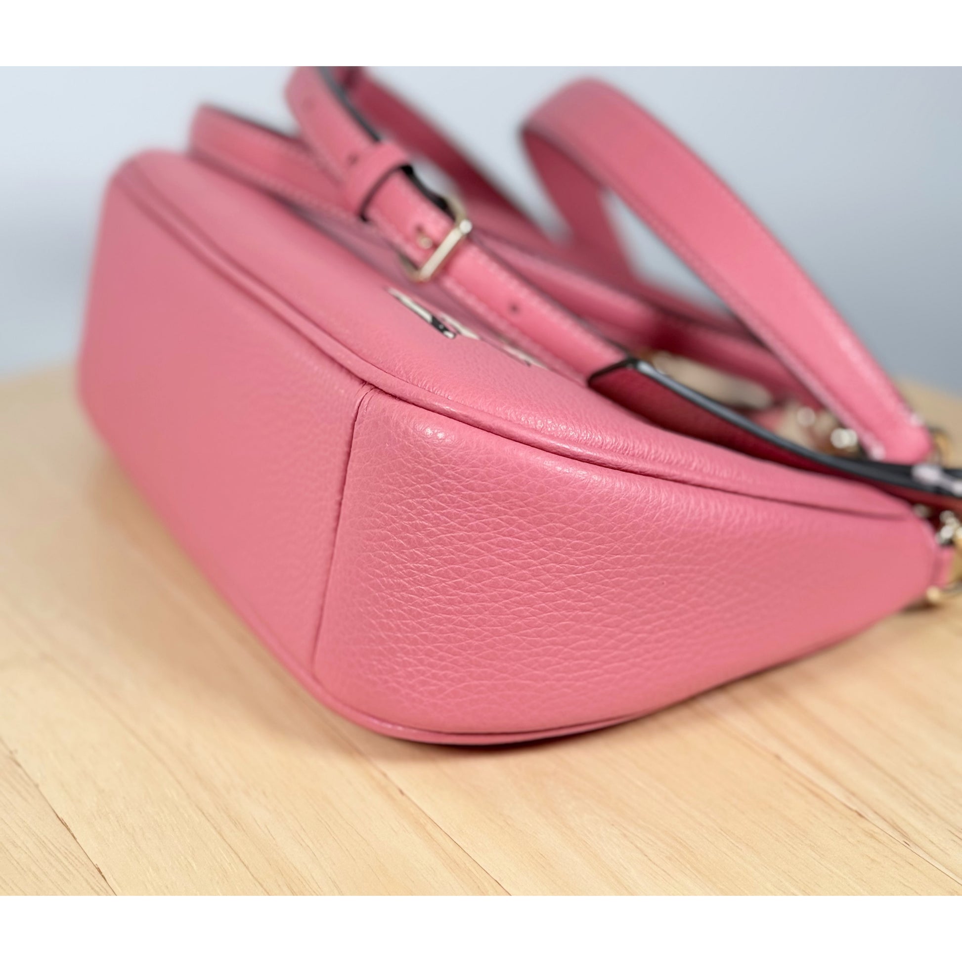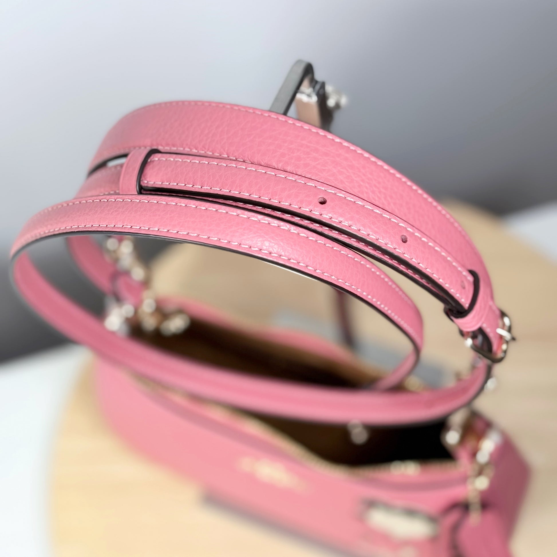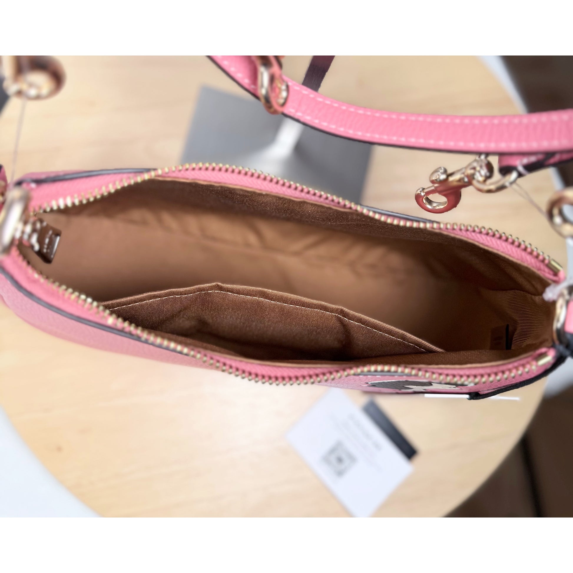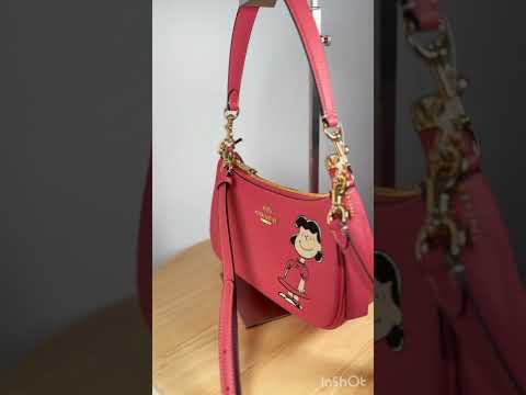 Authentic Coach x Peanuts Teri Shoulder Bag in Bright Coral Multi pebbled leather featuring Lucy. Special 75th Anniversary limited edition collaboration. Features detachable handle (8.5" drop), detachable strap (22.75" drop for shoulder or crossbody), inside multifunction pocket, and secure zip-top closure.