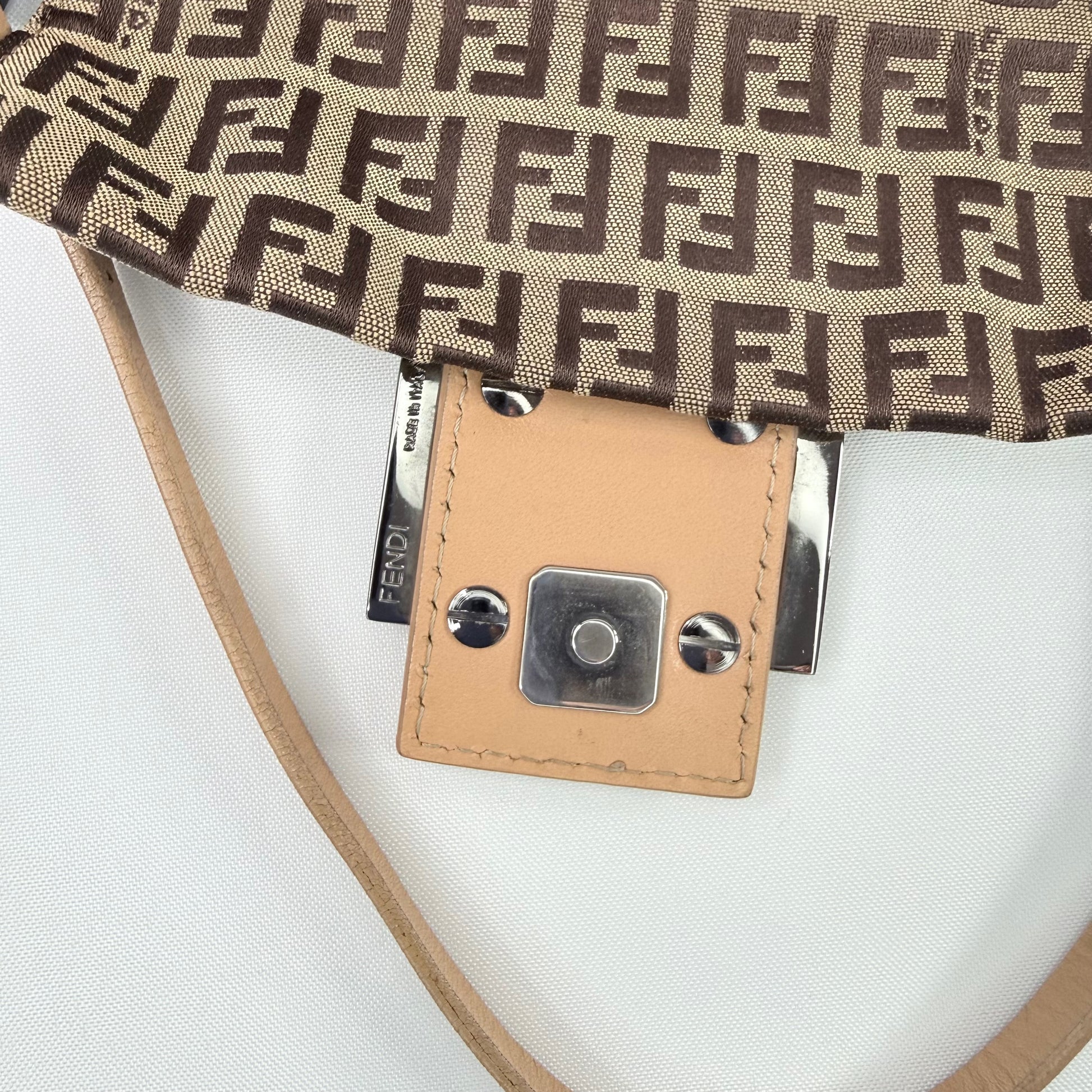 Finished with silver-tone FF buckle hardware and a magnetic snap closure, this mini baguette is effortlessly chic and easy to wear from day to evening. Its slim profile makes it ideal for carrying essentials while adding refined Fendi sophistication to any look.