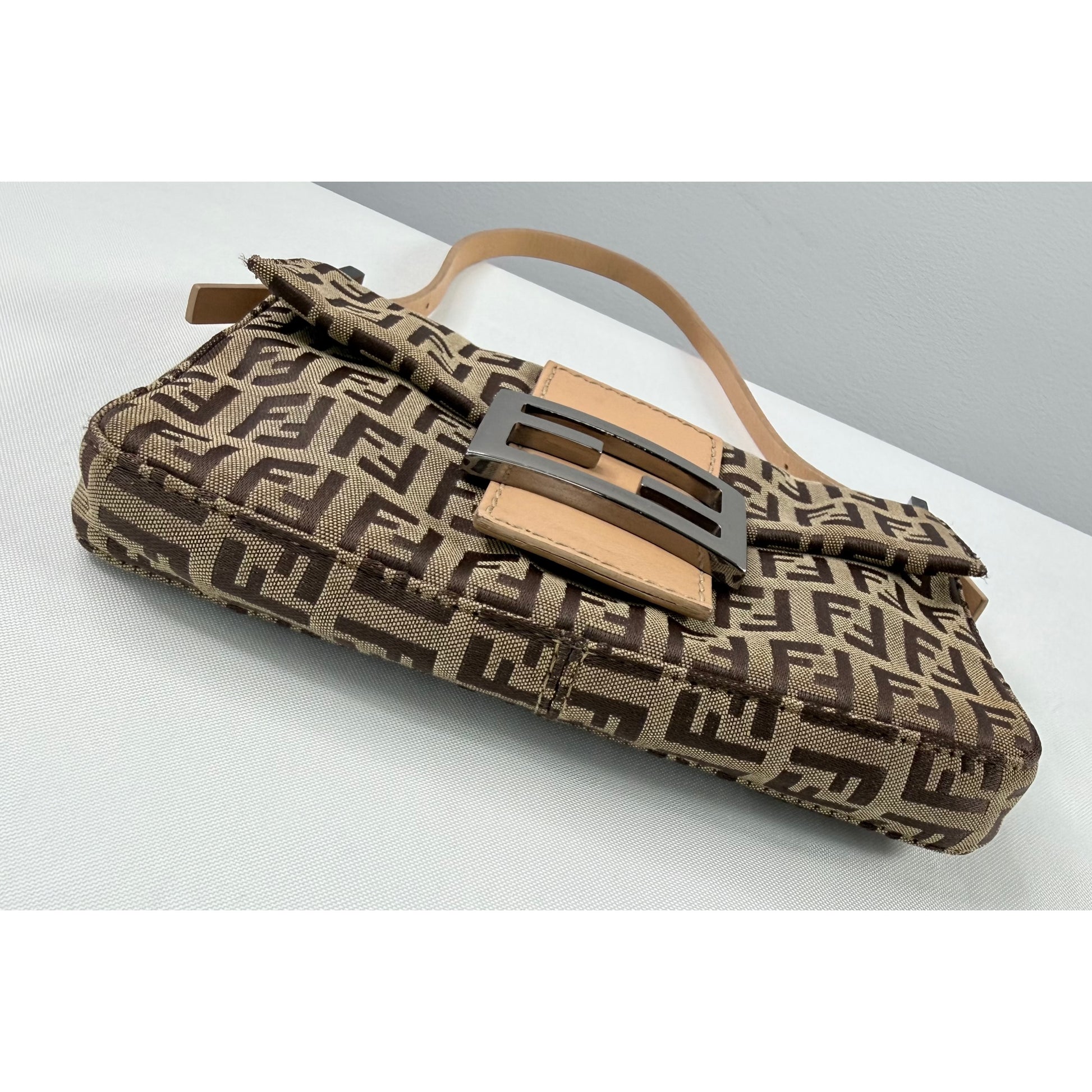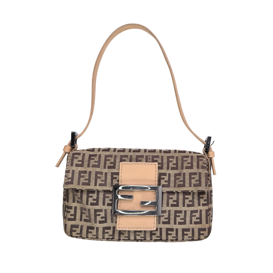 This Fendi Mini Zucchino Baguette features the brand’s iconic FF canvas in a compact, timeless silhouette. Crafted in Italy, this elegant shoulder bag reflects Fendi’s signature balance of understated luxury and everyday functionality.