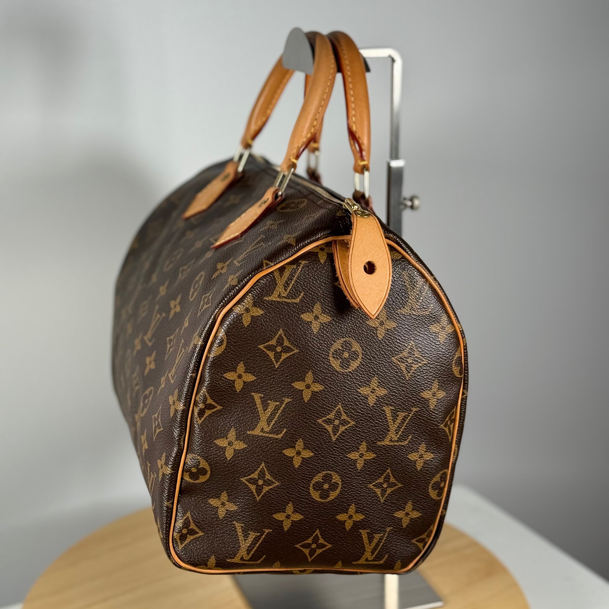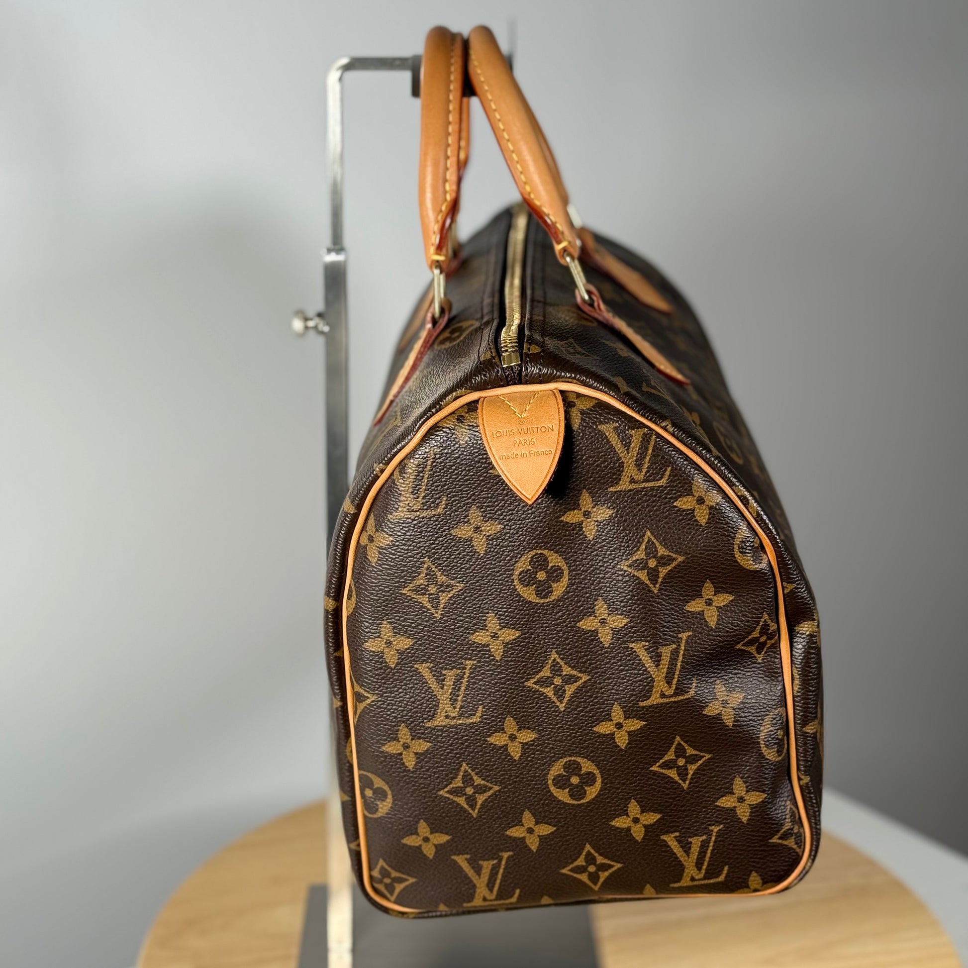 Authentic Louis Vuitton Speedy 30 in Monogram coated canvas with natural vachetta leather trim. Features top zip closure, dual rolled handles, and spacious interior. Timeless and iconic everyday satchel. Includes dust bag, lock, and key. Made in France, Date code: TH4088 (48th week of 2008) Verified authentic — buy with confidence.