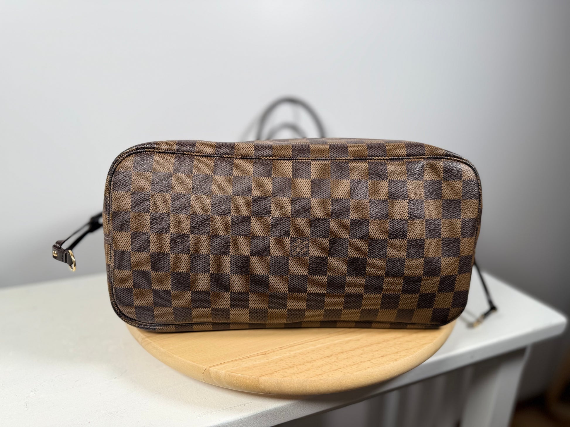 Authentic Louis Vuitton Neverfull MM in Damier Ebene canvas with cherry red textile lining. Features slim leather handles, spacious open interior, and side drawstring laces to adjust shape. Timeless everyday tote. Made in France, Date Code AR1058 (produced in the 15th week of 2008).