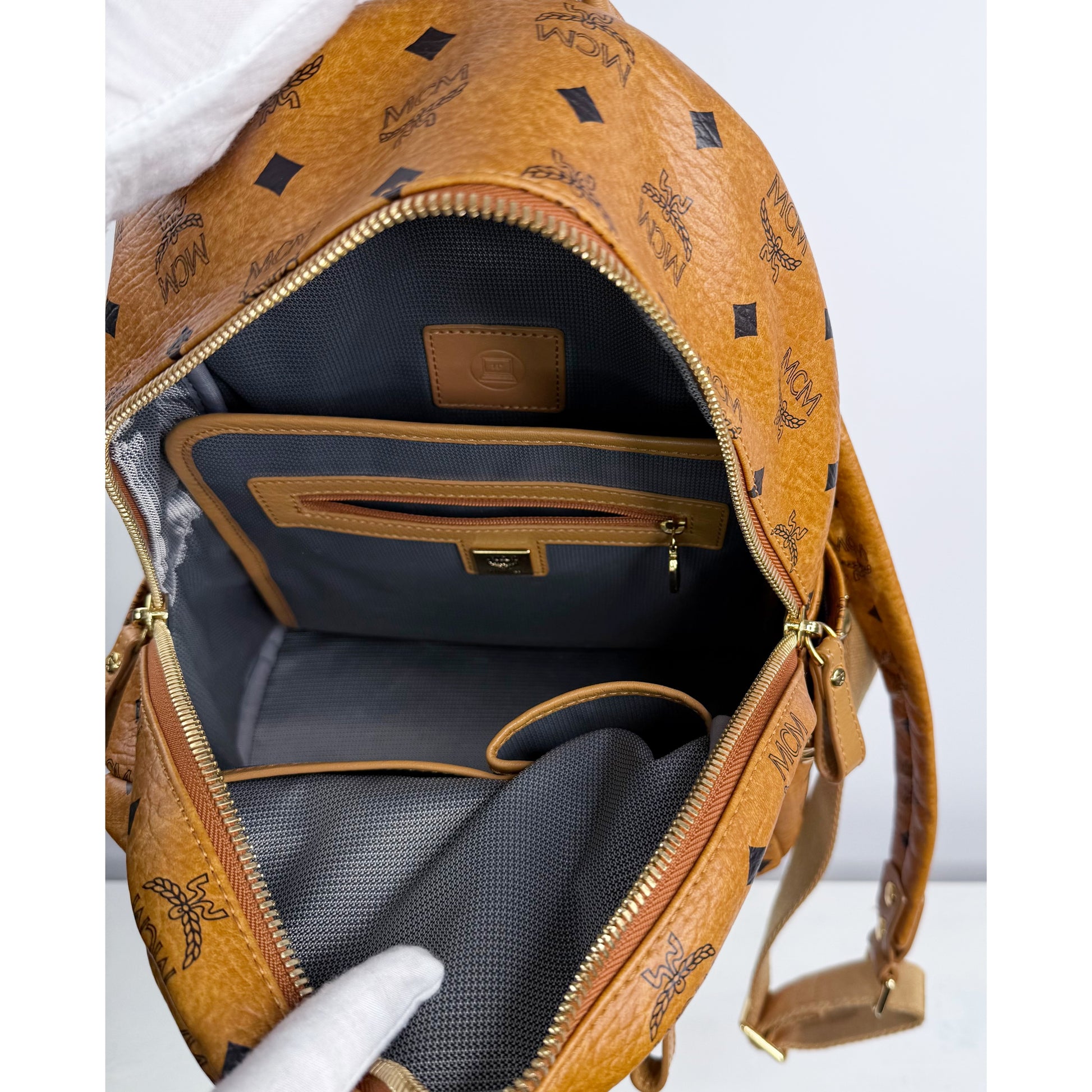 A classic and highly sought after MCM design, the Stark Visetos Backpack showcases the signature cognac monogram canvas and polished gold tone accents. Loved for its durability and lightweight construction, early Stark models hold strong collector appeal thanks to their structured silhouette and timeless streetwear influence. This size offers the perfect balance of practicality and compact luxury for everyday use. Made in South Korea, Style # MMKAEVE37CO001, Est. Retail CAD $1,500