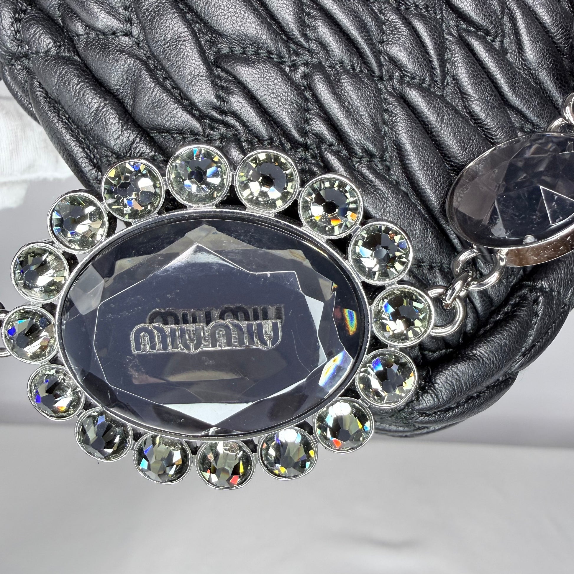 This elegant Miu Miu shoulder bag is crafted from luxurious cloquet quilted nappa leather, offering a softly structured silhouette with refined feminine character. Designed with two removable carrying options, it can be styled with the braided leather shoulder strap for everyday wear or elevated with the statement Plexiglas and crystal-embellished strap for special occasions. A Swarovski-studded turn-lock closure completes the look, balancing playful glamour with timeless versatility. Est. Retail: approx. CAD $3,500+
