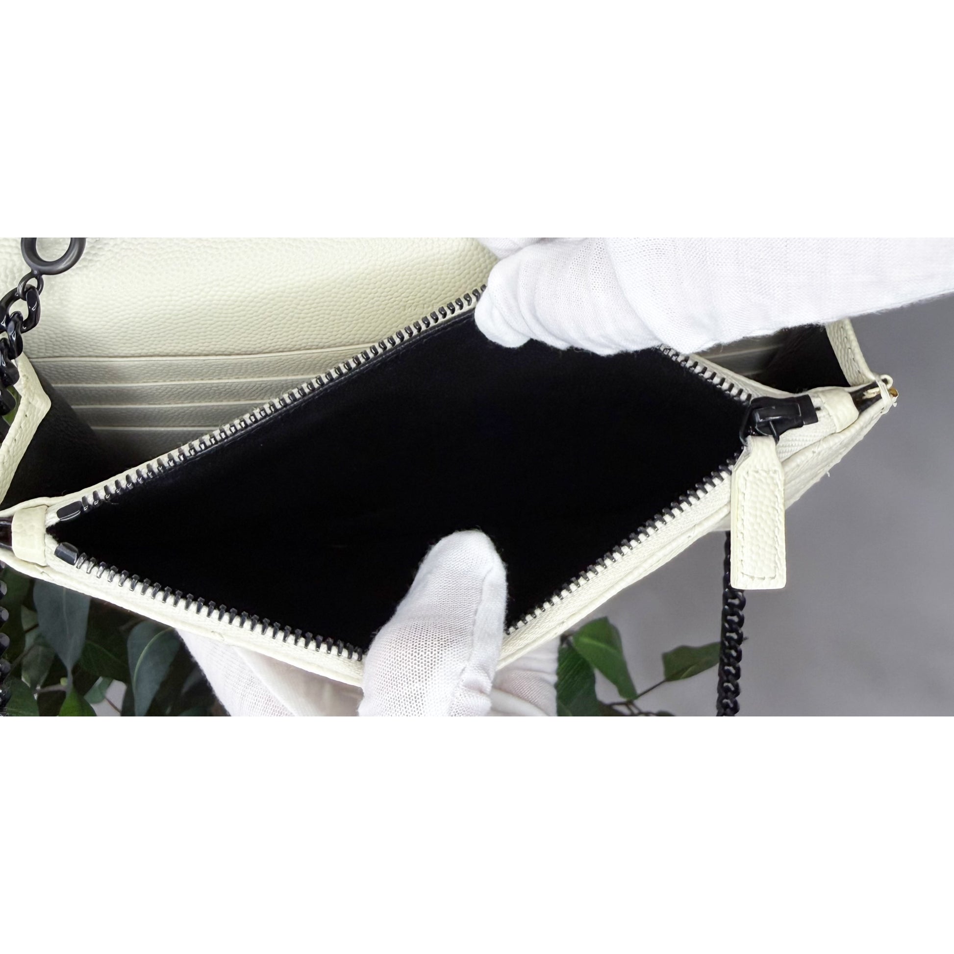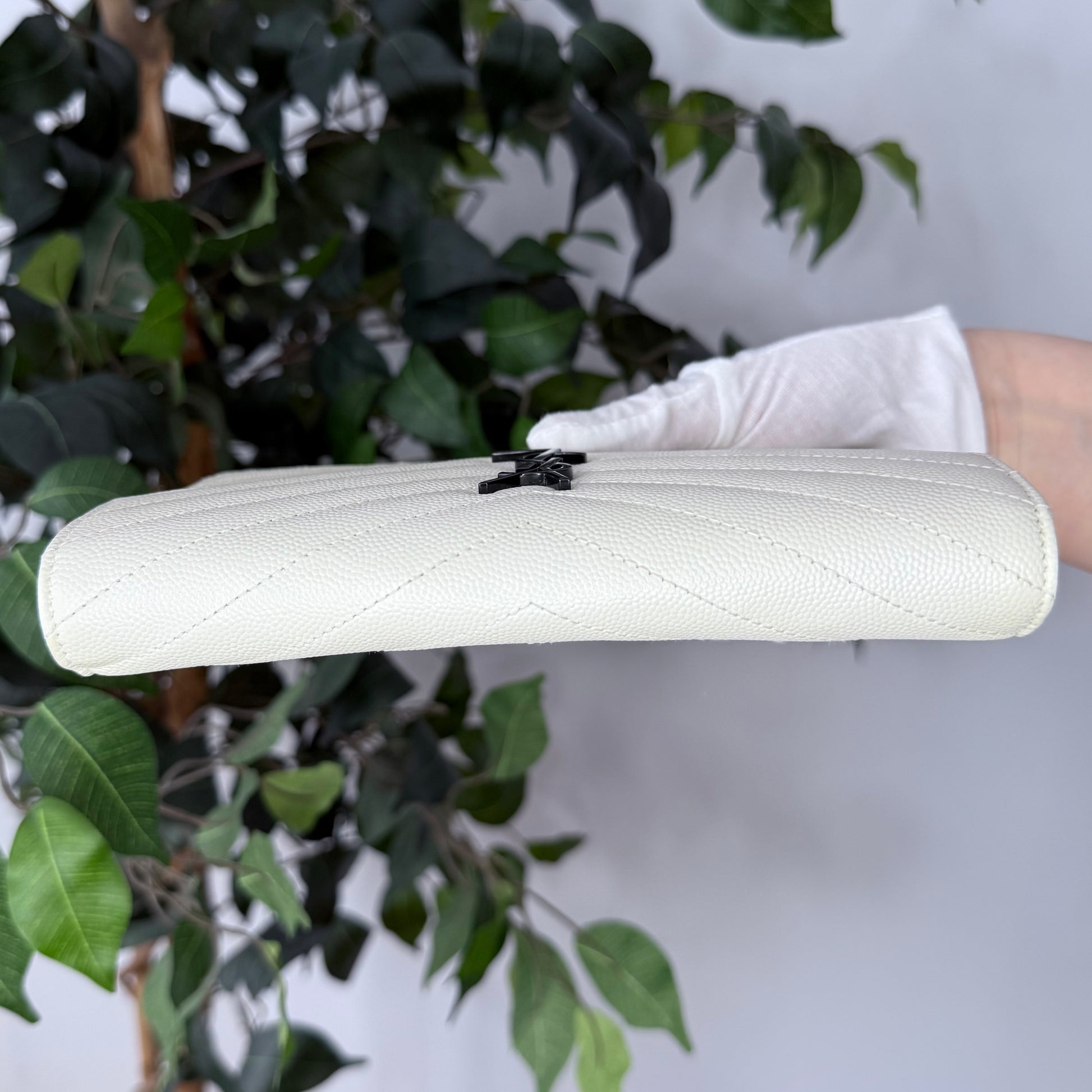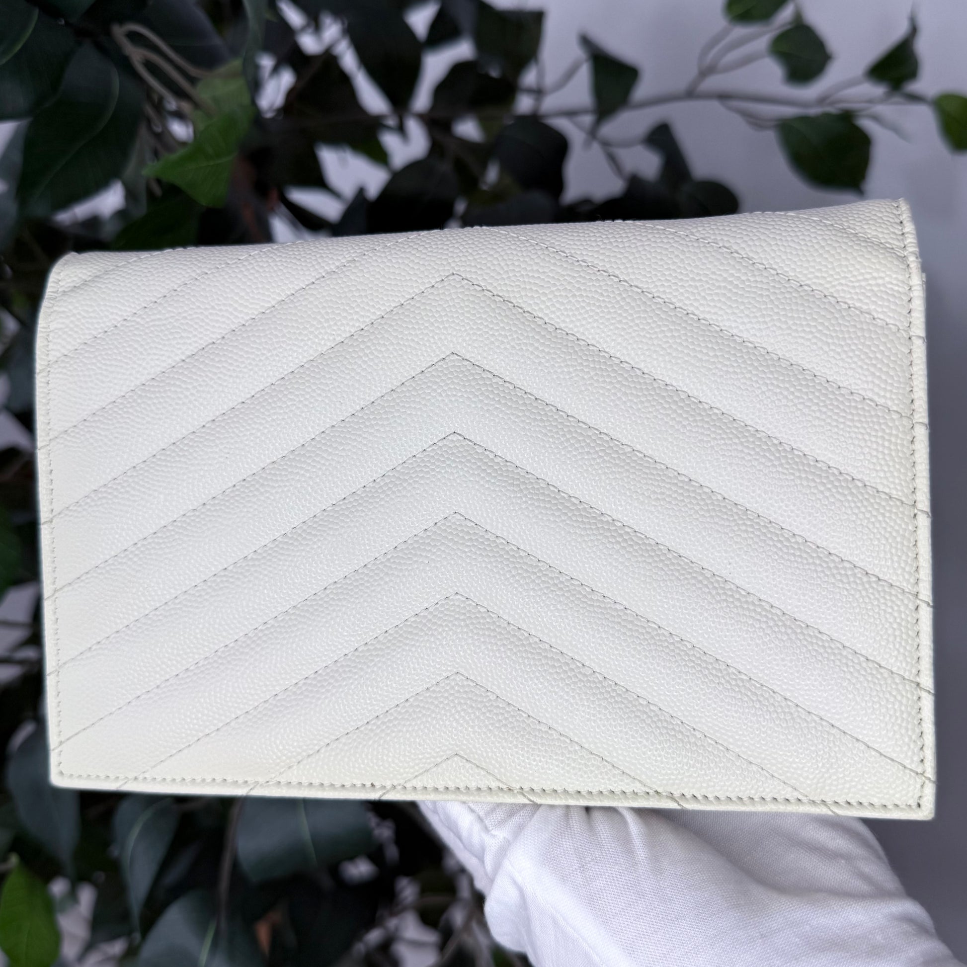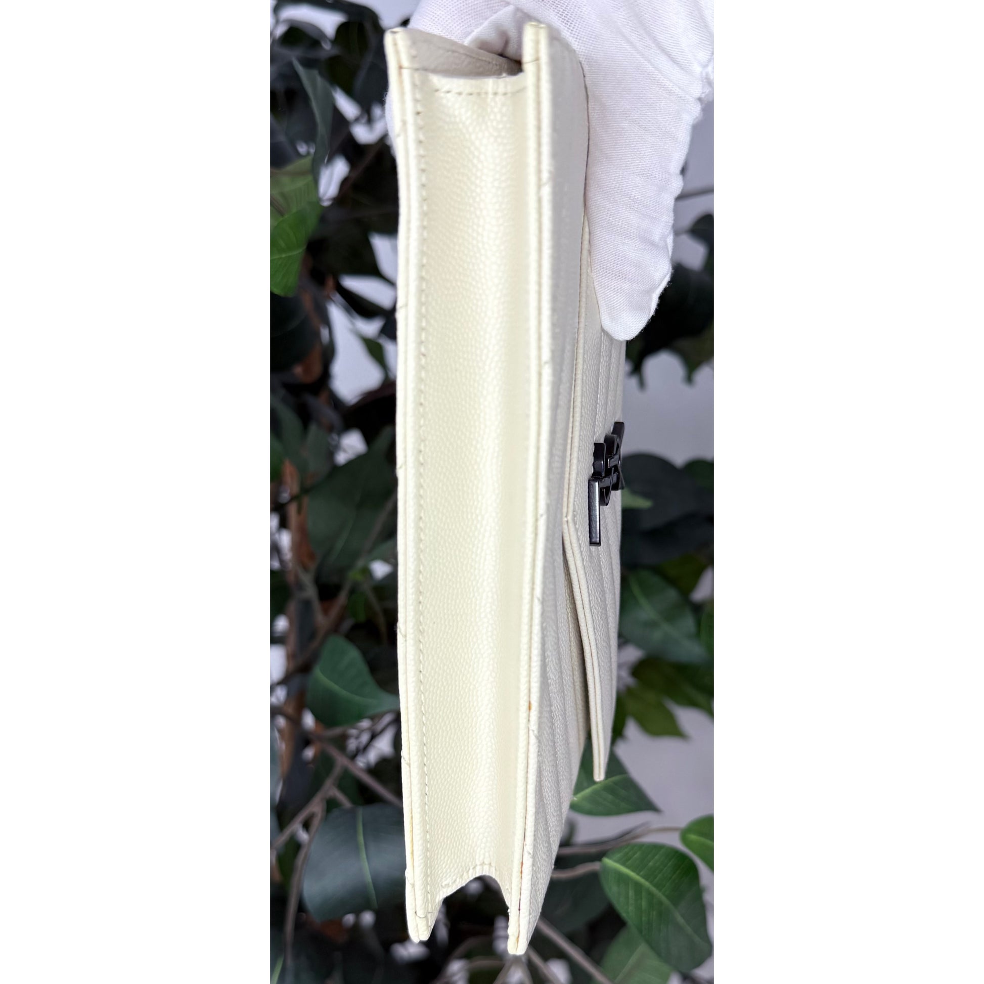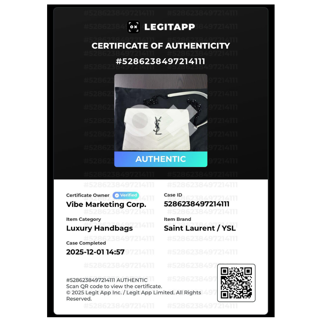 Crafted in durable white grained calfskin and finished with sleek gunmetal hardware, this piece transitions effortlessly from day to night. Wear it crossbody, on the shoulder, as a clutch or as a wallet. A timeless, versatile favourite among YSL lovers. Est. Retail C$2,064