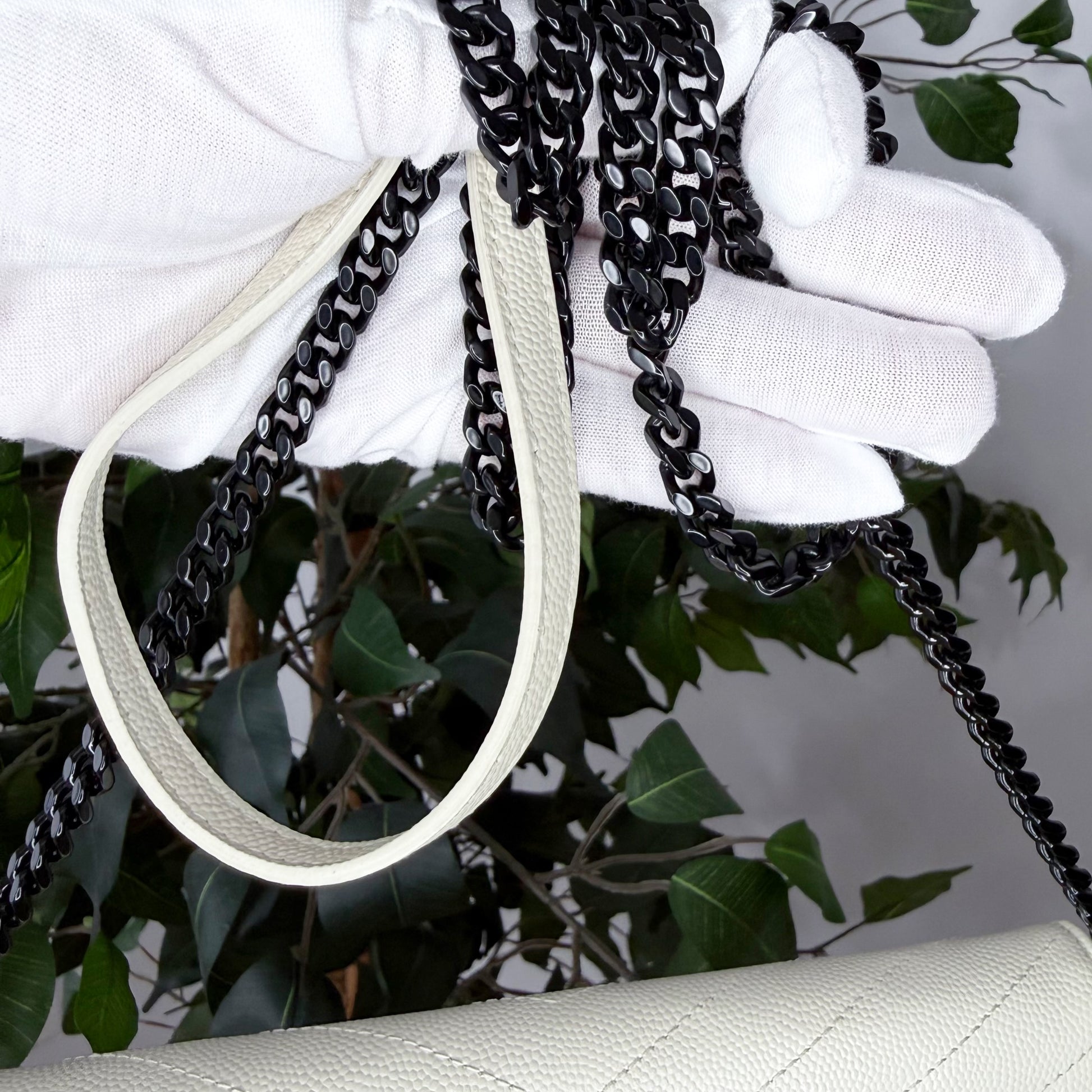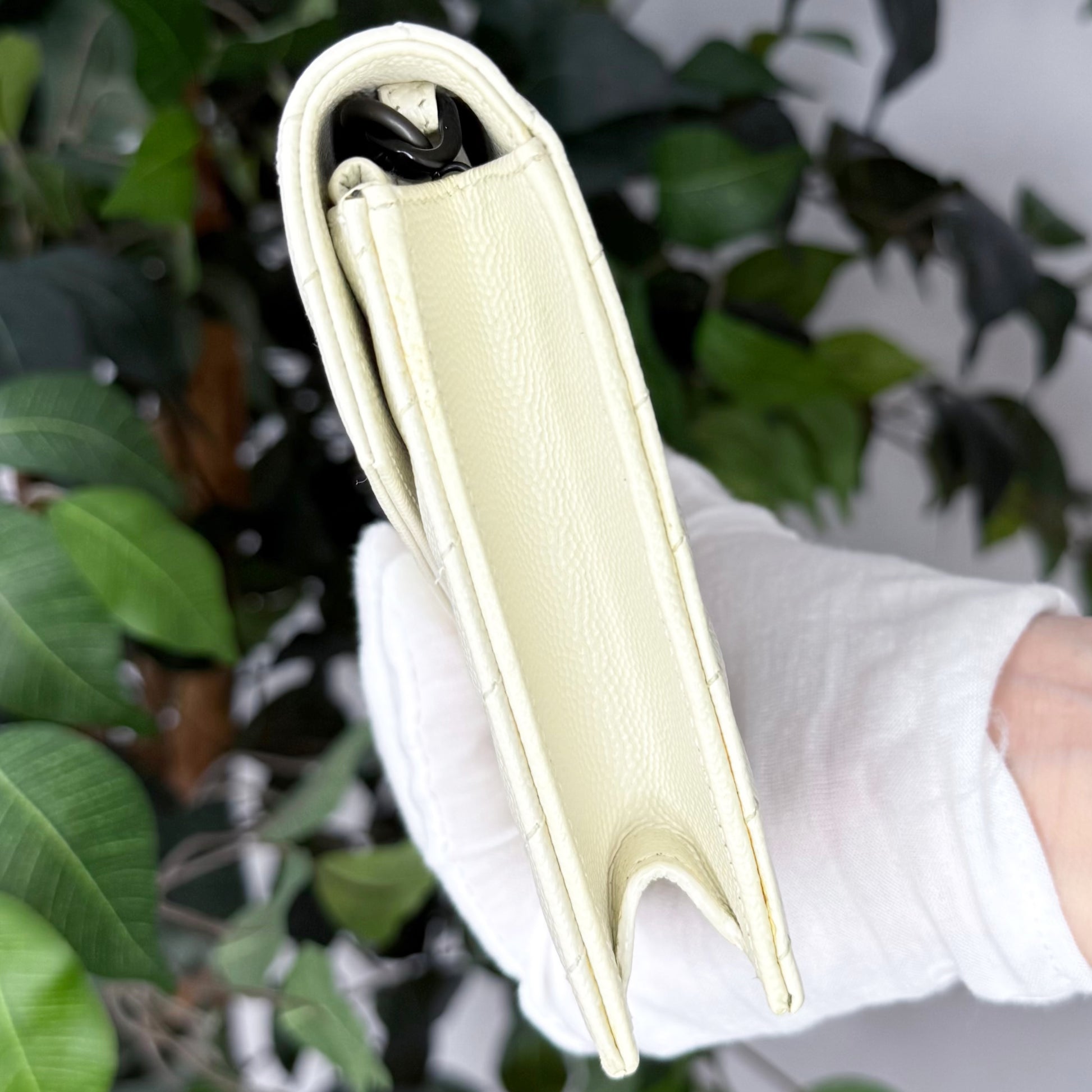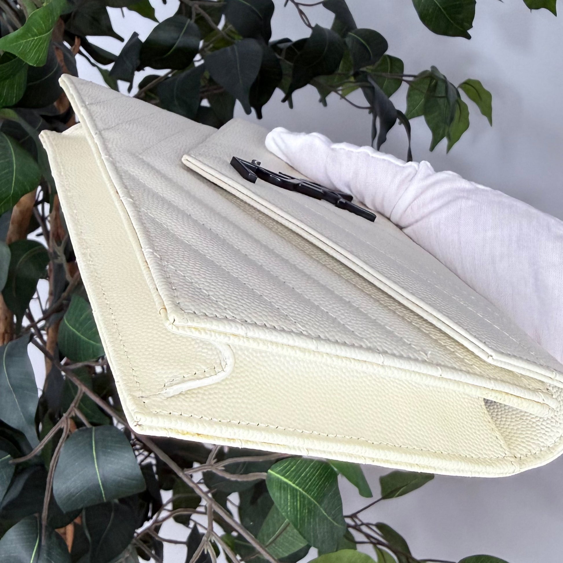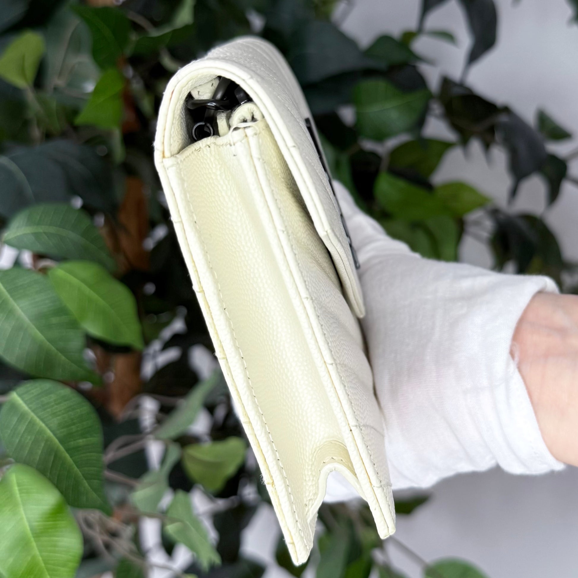 Crafted in durable white grained calfskin and finished with sleek gunmetal hardware, this piece transitions effortlessly from day to night. Wear it crossbody, on the shoulder, as a clutch or as a wallet. A timeless, versatile favourite among YSL lovers. Est. Retail C$2,064