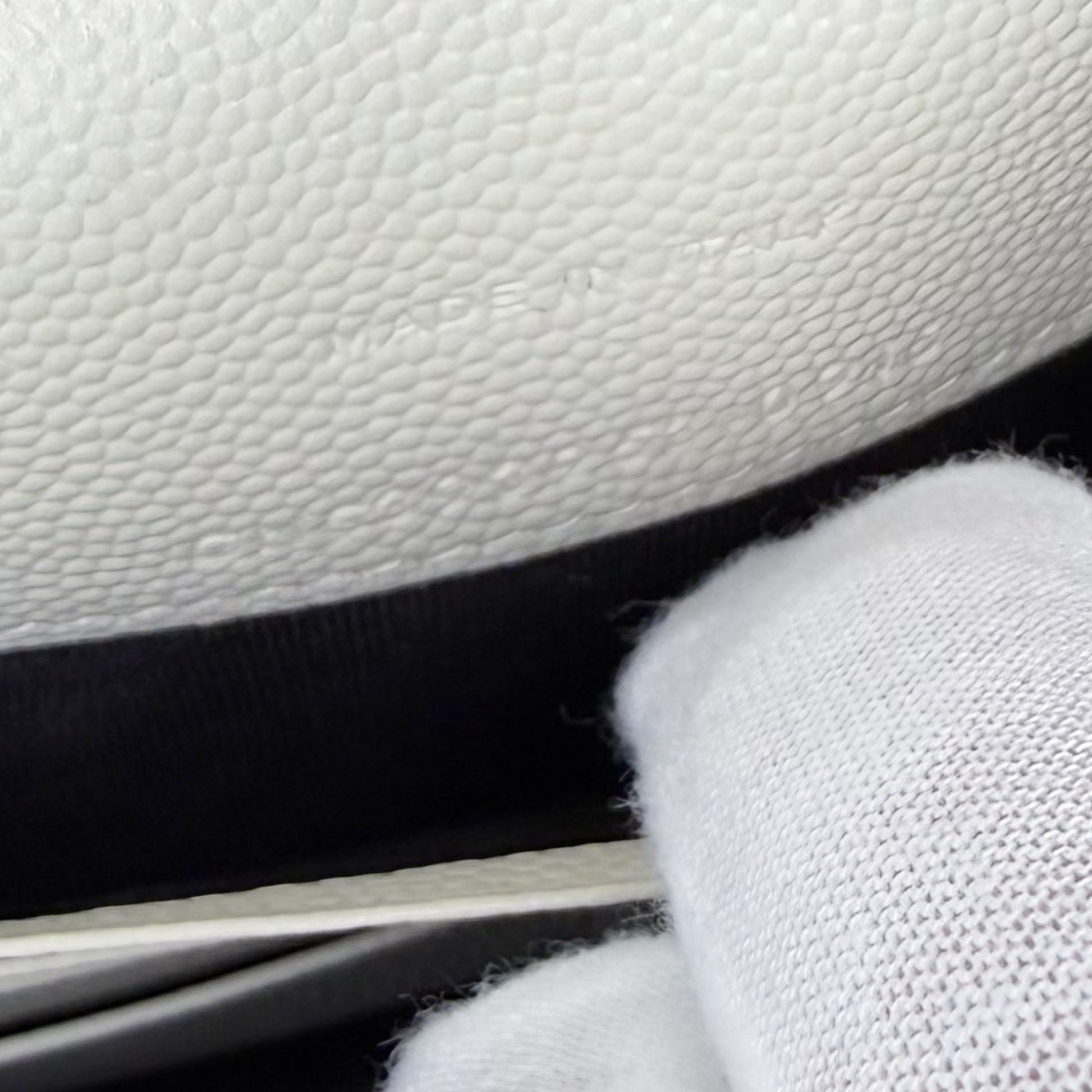 Surface: White grained leather with light rubbing on high-touch points and subtle warm-toned patina along some edges.